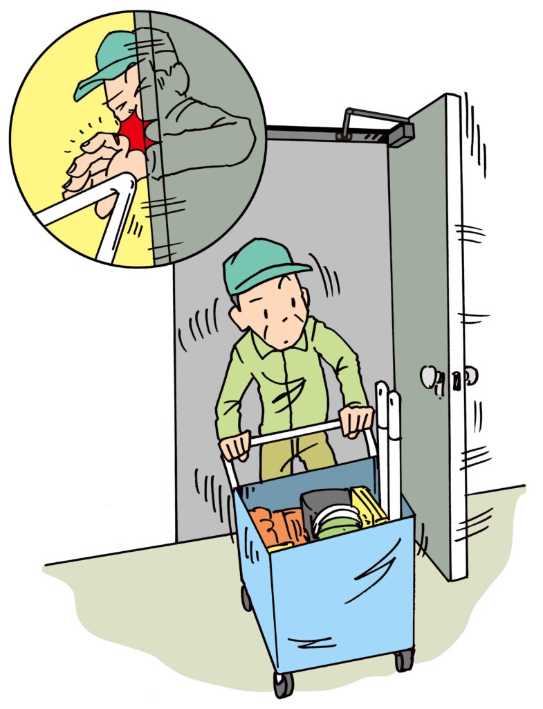 しばしば“閉まりかけてきたドア”だけに焦点があたり、“把手を持つ手の位置”について見逃されてしまいがちですが、台車運搬時の事故では、把手を持つ手を壁との間で挟む、積んだ荷がズレてきて手に当るなど、把手の持ち方に原因があることも少なくありません。