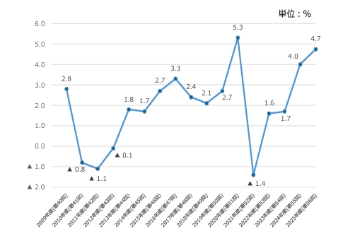 2025年度の売上高見通し(対前年度比)は、全体平均で+6.3%となった。「4%以上」が46.0%と最多。