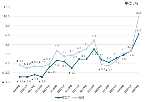 2025年度のビルメンテナンス業務の契約改定率(継続物件契約額の対前年度比増加率)は、官公庁6.2%、民間10.0%となり、ともに前回調査結果(官公庁2.7%、民間2.6%)を大きく上回った。コロナ禍前の2019年度水準をも上回り、価格転嫁が順調に進んでいることが示唆される。