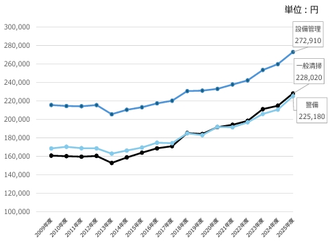 30〜50歳程度の常勤従業員を中途採用で募集する時の平均賃金は、一般清掃が約22.8万円、設備管理が約27.3万円、警備が約22.5万円となった。前年度比で5〜6%台の増加となり、前回調査(1〜2%台)より上昇幅が拡大した。