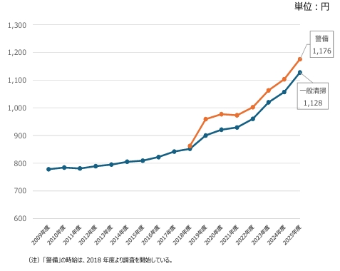 パートタイマーの平均時給は、一般清掃が1,128円、警備が1,176円となり、ともに過去最高額を更新した。