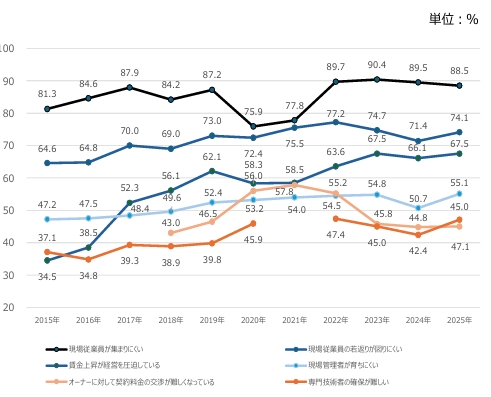 今回調査では「現場管理者が育ちにくい」(55.1%)や「専門技術者の確保が難しい」(47.1%)が前回調査より4ポイント以上上回り、現場従業員以外の人材不足も課題として重視される傾向がうかがえた。