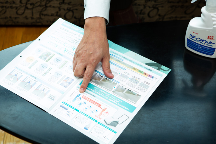 従来は染み部分に洗剤をつけて除去していましたが、そうすると散布していたドライピッカーも一緒に取れてしまいます。そこで、染み取りの中にドライピッカーを混ぜた新商品を3月に発売しました。染み部分に吹き付けておくと、染みが除去できると同時に、ドライピッカーを自動的に補充できます。