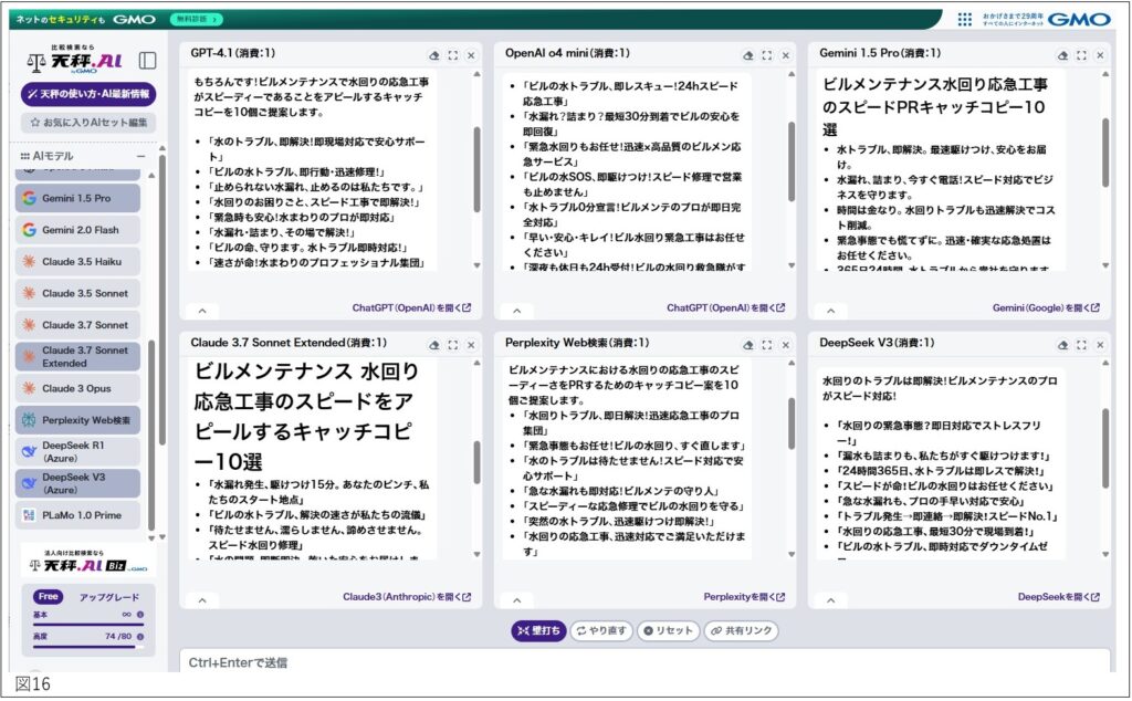「ビルメンテナンスで水回りの応急工事がスピーディーな業務をPRするためのキャッチコピーを10個作って」と指示した画面を参考にしてみてください(図16)