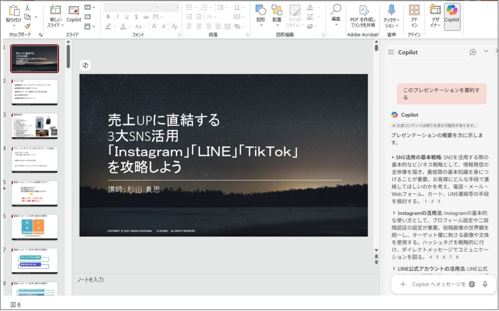 プレゼンテーションアプリのPowerPointでは、プレゼン内容の要約を説明させたり(図6)、新規のプレゼンを作成させることができます(図7、図8)。