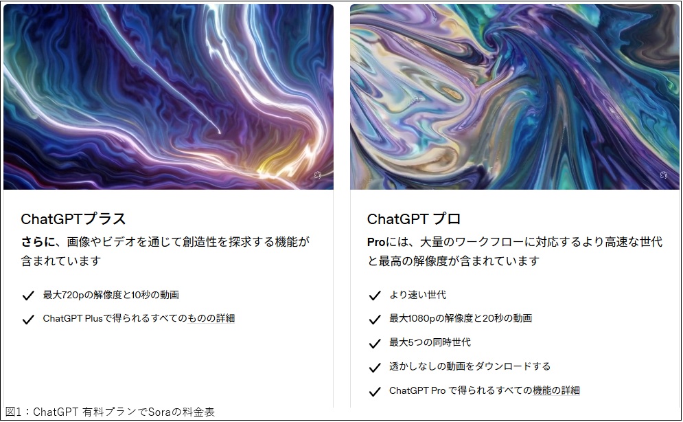 PlusプランとProプランでは最大解像度や動画の尺の長さ、同時生成数、透かしなどに違いがあります。(図1)