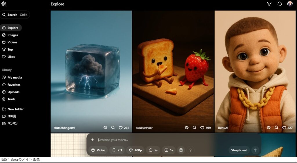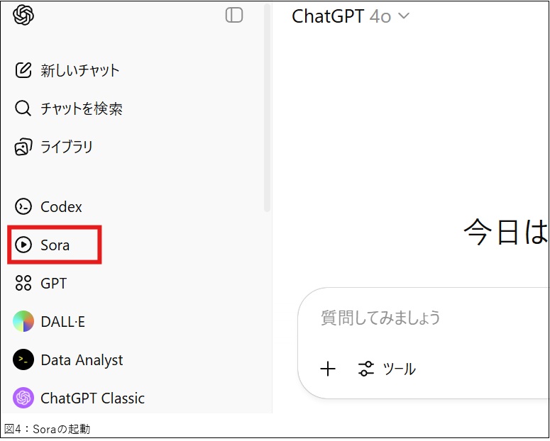 Soraは、ChatGPTのサイドバーから「Sora」のリンクをクリックすると起動します。(図4)