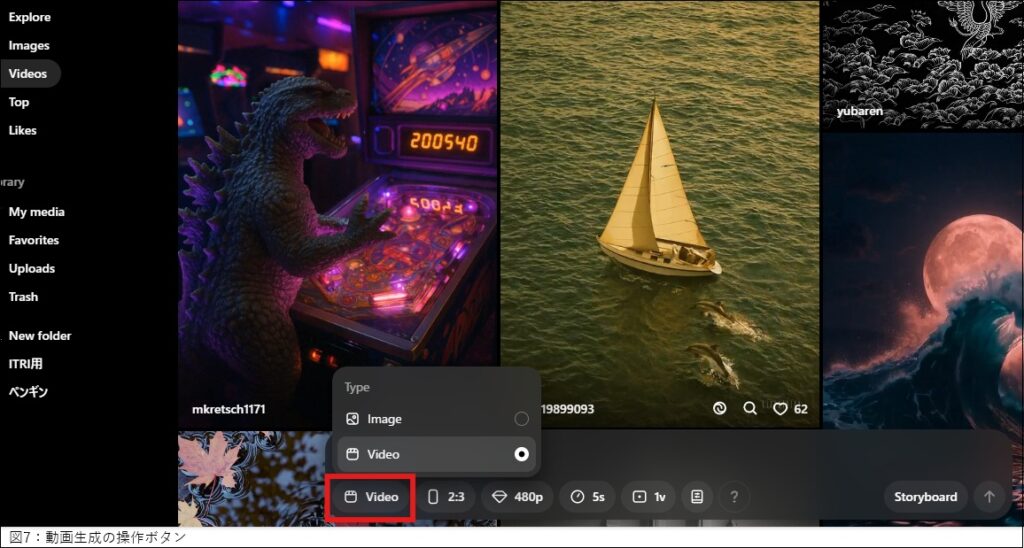 図6の状態で画面下側に動画を生成するための操作ボタン類が並ぶ入力欄があるので、ここで「Video」を選びます。(図7)