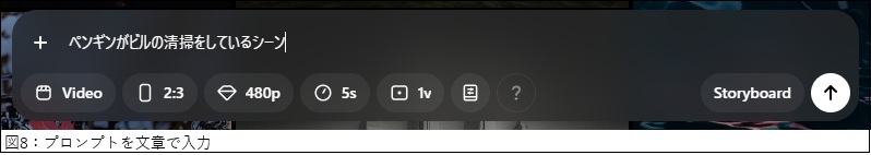 今回は「ペンギンがビルの清掃をしているシーン」と指示してみました。文章を入力したら右側の「↑」ボタンで送信です。