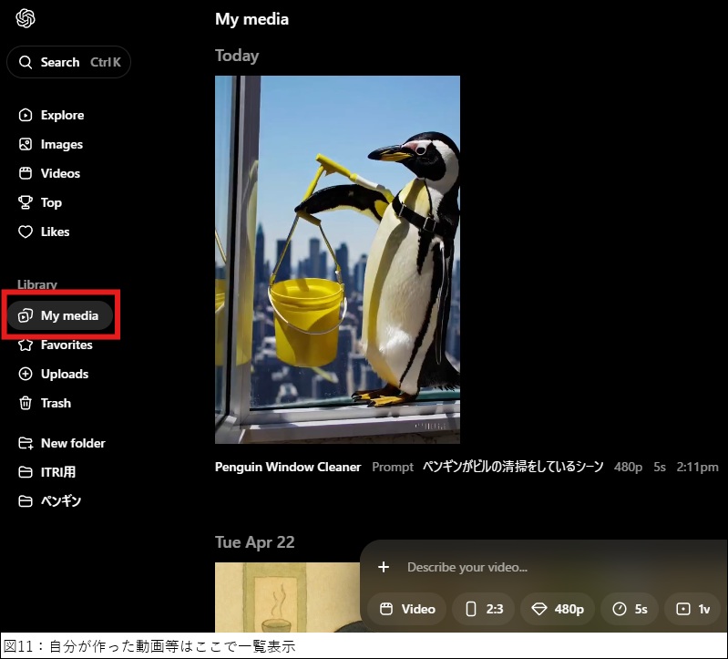 自分で作成した動画等は左側メニューの「My media」から一覧で見られます。(図11)