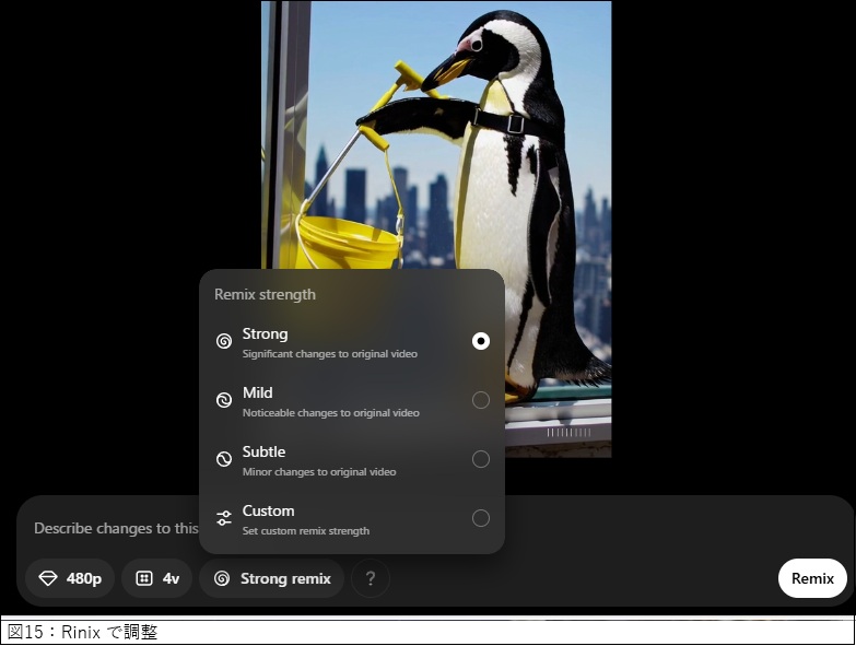 「Remix」はプロンプトと合わせて変更の度合いを大幅にするか最小限にするかなどを段階的に指定できます。(図15)