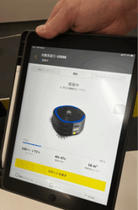 ・タブレットでリモコン操作する様子。バッテリー残量や、清掃済みエリアの割合などをリアルタイムで確認できる。