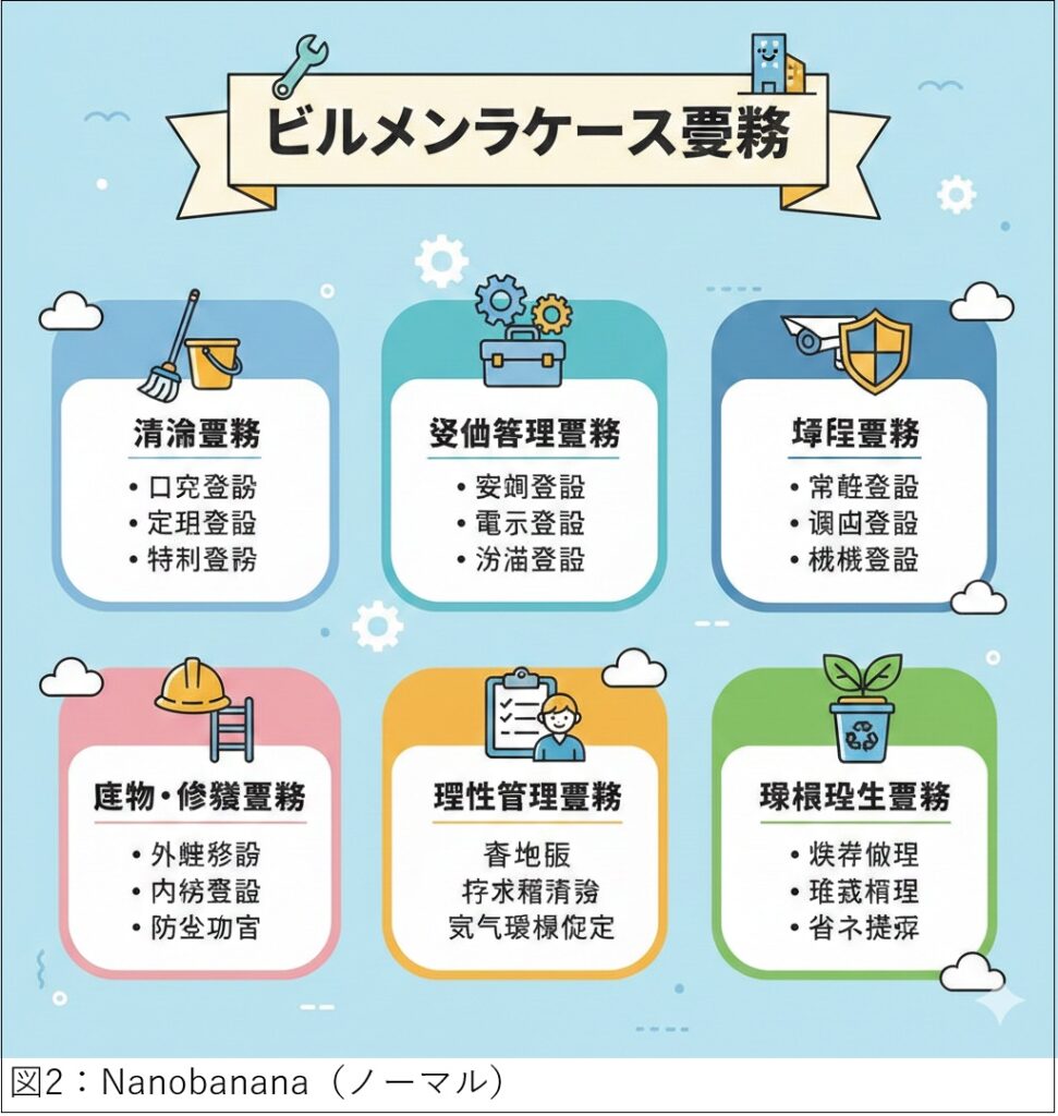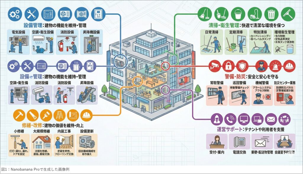 これは、Geminiのチャットで「ビルメンテナンス業務のジャンルを網羅して一覧にしたイラストを描いて」と指示しただけで出力された画像です。
