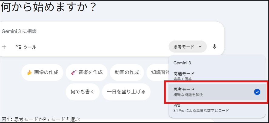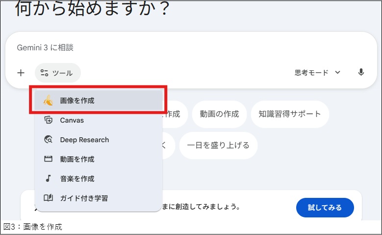 クオリティの高いNano Banana Proで画像生成させたい場合は、Geminiのチャットで「ツール」のメニューから「画像を作成」を選び(図03)、右側のモード選択で「思考モード」か「Pro」モードを使って指示を出します(図04)。高速モードでは旧Nano Bananaで画像が作成されました(筆者環境)。無料プランでは枚数制限があると言われていますので、活用シーンを厳選しましょう。