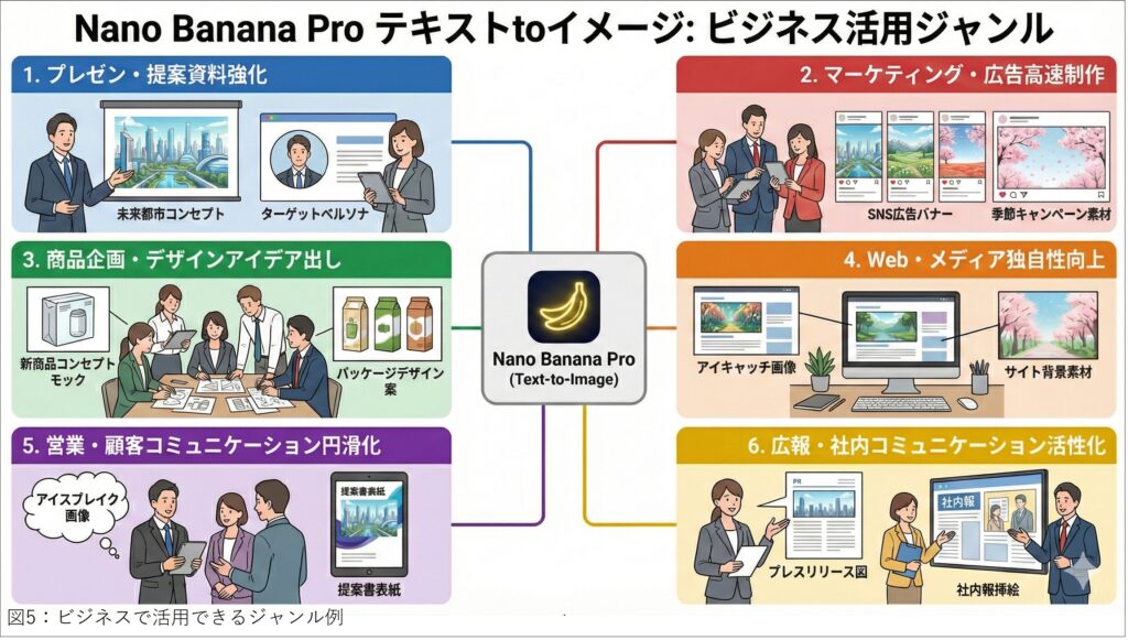 さて、このNano Banana Proを仕事でどのように使えるかをGeminiに訊いてイラスト化してもらいました。(図05)