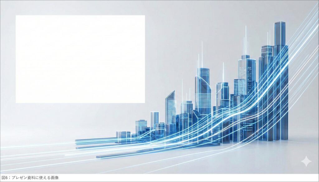 プロンプト例:「成長と未来」をテーマにした抽象的なビル群の3Dビジュアライゼーション。青と白の光るラインが右肩上がりに上昇していくグラフのデザイン。背景はクリーンでミニマル。左側にタイトルを入れるための大きな余白を空ける。高解像度、プロフェッショナルなライティング。(図06)