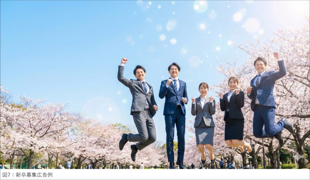 プロンプト例:新卒募集の広告用に、[桜が満開の明るい公園]で、[新しいスーツを着たフレッシュな若い男女]が笑顔でジャンプしている。背景は春の青空で、キラキラとした光のエフェクト。写真のようにリアルで、希望に満ちた雰囲気。画像の左上または上部に、テキストを入れるための広い青空の余白を空ける。(図07)