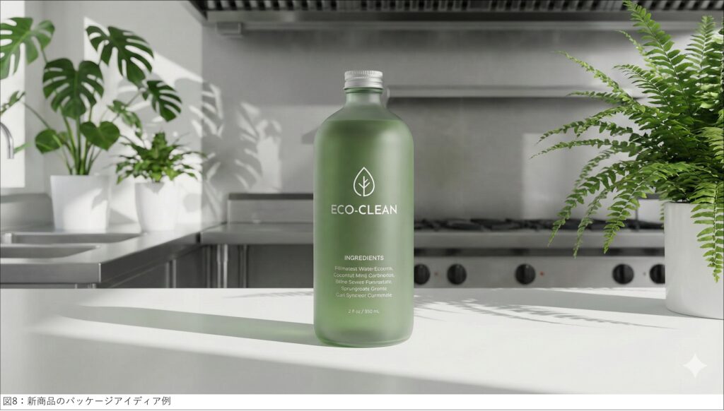 プロンプト例:環境に配慮したキッチンシンク用洗浄剤のボトルデザイン。すりガラス製のシンプルなグリーンの円柱形ボトル。ラベルは貼らず、白い文字でブランドロゴと成分表示が直接印刷できるミニマルなデザイン。背景は、観葉植物の影が落ちる白くクリーンな業務用キッチン。(図08)