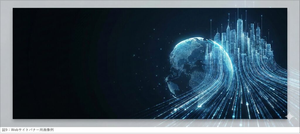 プロンプト例:Webサイトのトップページ用の横長バナー画像。「未来を創るビルメンテナンステクノロジー」をテーマにした抽象的な3Dビジュアライゼーション。青と白の光るデータの流れが、地球や都市の形を形成しながら上昇していく。クリーンで洗練された、SF映画のような雰囲気。高解像度。画面の左側は光の粒子が少ない暗めの背景にし、白いキャッチコピーを乗せるための広い余白を空ける。(図09)