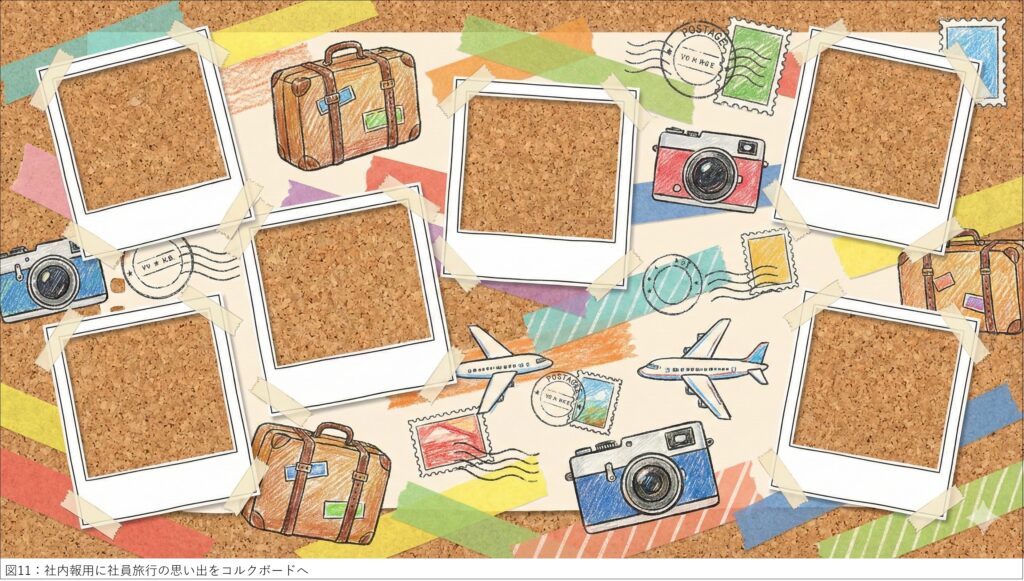 プロンプト例:社内報の背景画像。「楽しい社員旅行の思い出」をテーマにした、手作りのスクラップブック風のデザイン。コルクボードの背景に、カラフルなマスキングテープ、旅行カバン、カメラ、飛行機、切手のイラストが散りばめられている。全体的に温かみがあり、賑やかでポップな雰囲気。写真を貼り付けるための空白のスペース(ポラロイド風の枠など)がいくつも空いている構図。手描きの質感。(図11)