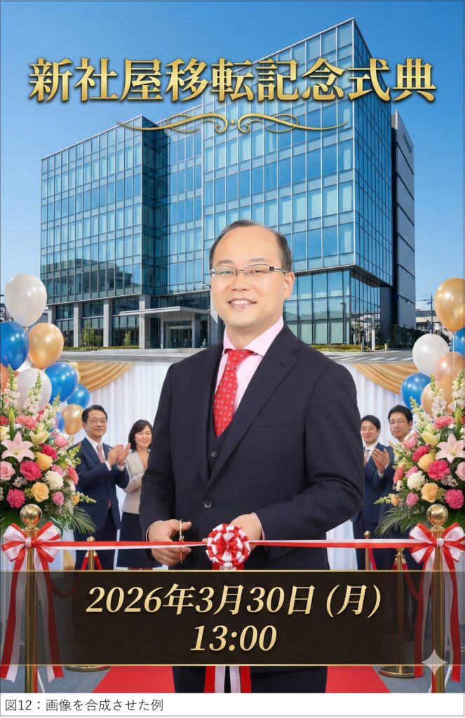 プロンプト例:この人物画像を社長として合成して、「新社屋移転記念式典」「2026年3月30日(月) 13:00」の文字を入れて、オープニングセレモニー用の案内用画像を作成して。(図12)