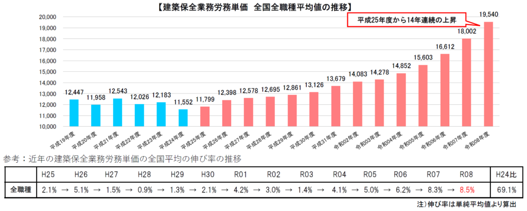 なお、令和8年度の建築保全業務労務単価は全国・全職種平均19,540円(令和7年度比+8.5%)で、14年連続の上昇となっています。
