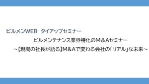 【10月26日まで限定アーカイブ配信】 ビルメンテナンス業界特化のM&Aセミナー ~【現場の社長が語る】M&Aで変わる会社の「リアル」な未来~【9月19日開催】