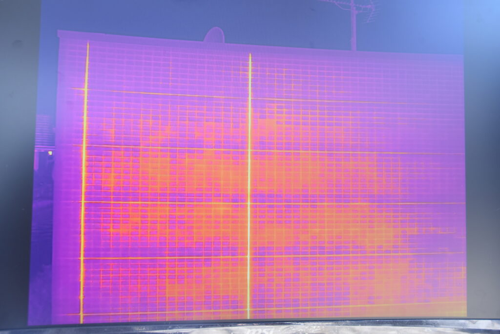 続いて、外壁を対象とした可視光カメラ・赤外線カメラによる点検デモを行いました。上の画像は、ドローンで撮影した 赤外線サーモグラフィによる外壁の温度分布 を示したものです。赤外線診断では、目視では分からない外壁内部の異常を、非接触・短時間で“温度差”として可視化できます。