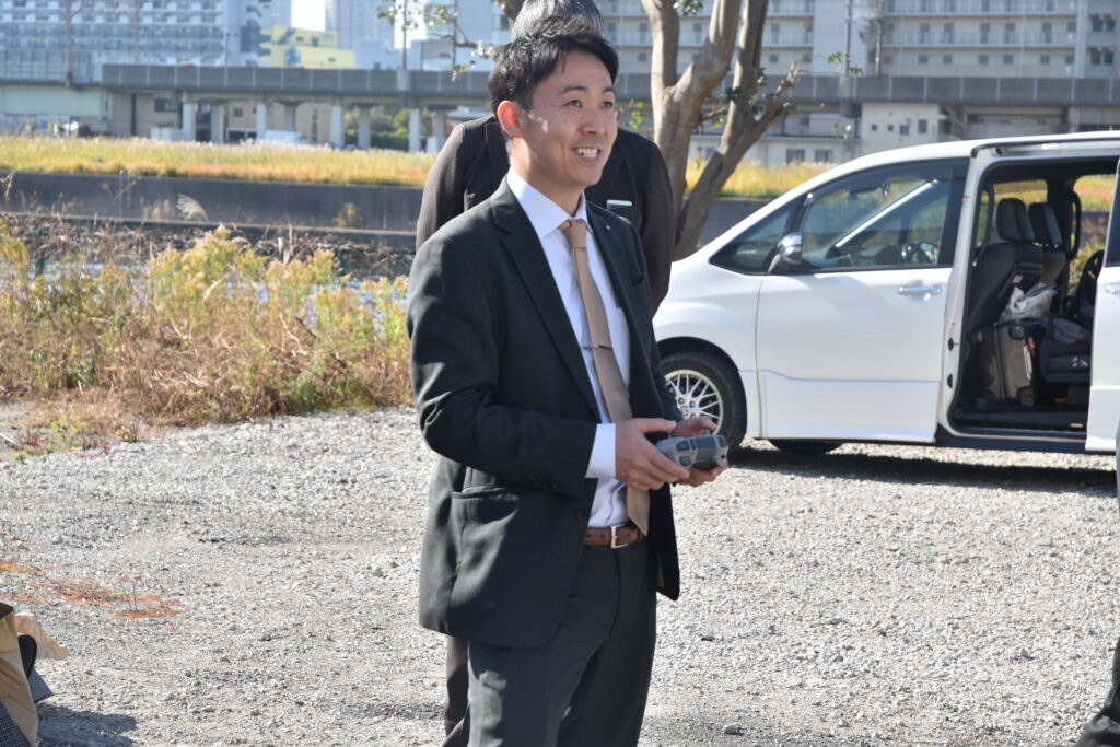 最後に、参加者の方々にも実際にスティックを握っていただき、位置をGPSで自動固定するGPSモードでの操縦体験を行いました。私も実際に操縦させていただきましたが、画面で見ているときのイメージよりもはるかに繊細な操作が求められ、正直かなり難しく感じました。