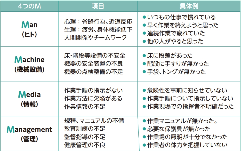 実際、現場に潜むリスクを100%取り除くことは容易ではありません。 冊子でも触れた「4つのM(ヒト・モノ・環境・管理)」に基づいて対策を講じても、 ちょっとした不注意や予期せぬ環境の変化によって事故はどうしても起こり得ます。